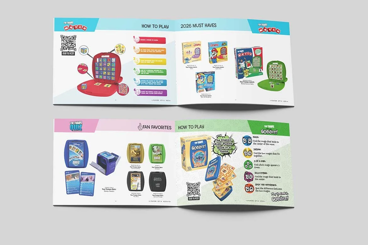 I design the annual UK and USA product catalogues for Winning Moves, a large-scale project that showcases hundreds of products across multiple categories. Working closely with the sales department, I plan the structure, organise content, and create a clean, cohesive layout that works across both markets.